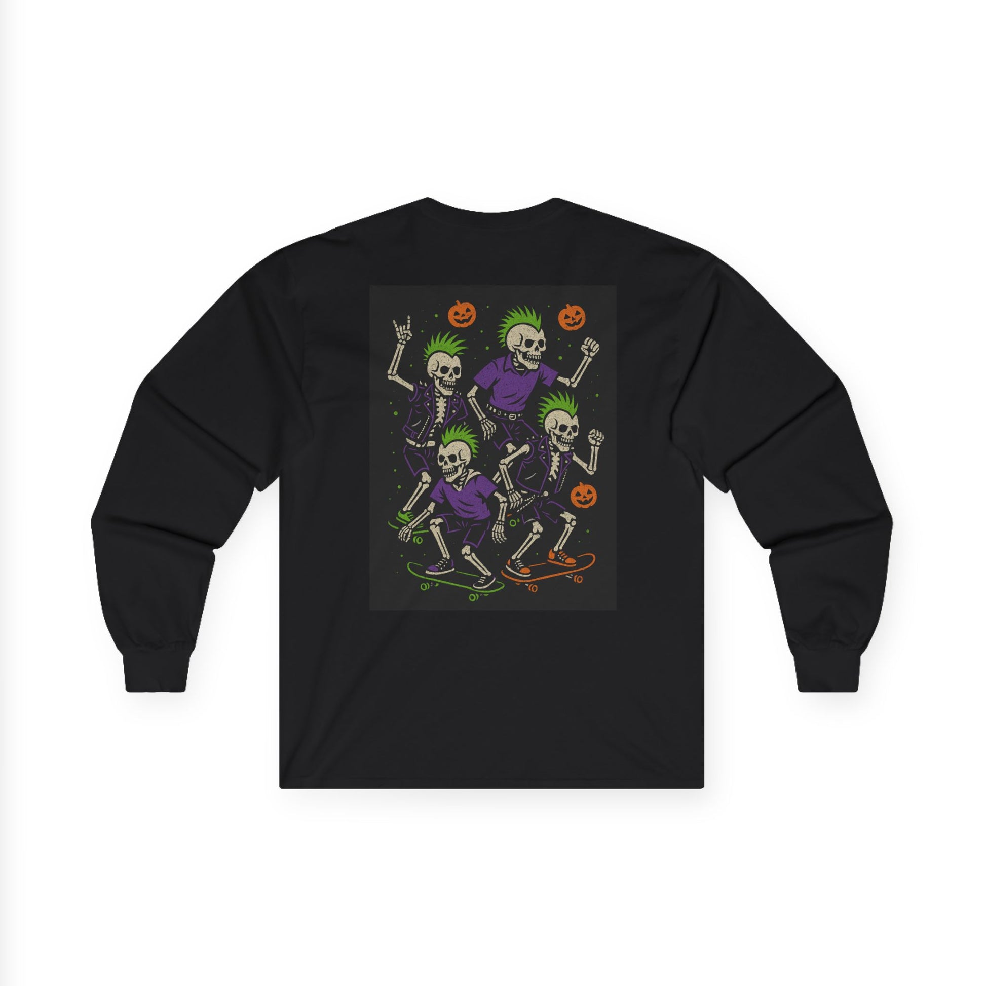 The back print cranks it even higher: a full skeleton skate crew tearing through Halloween night. Mohawks up, chains out, boards flying — this crew isn’t trick-or-treating… they’re taking over.