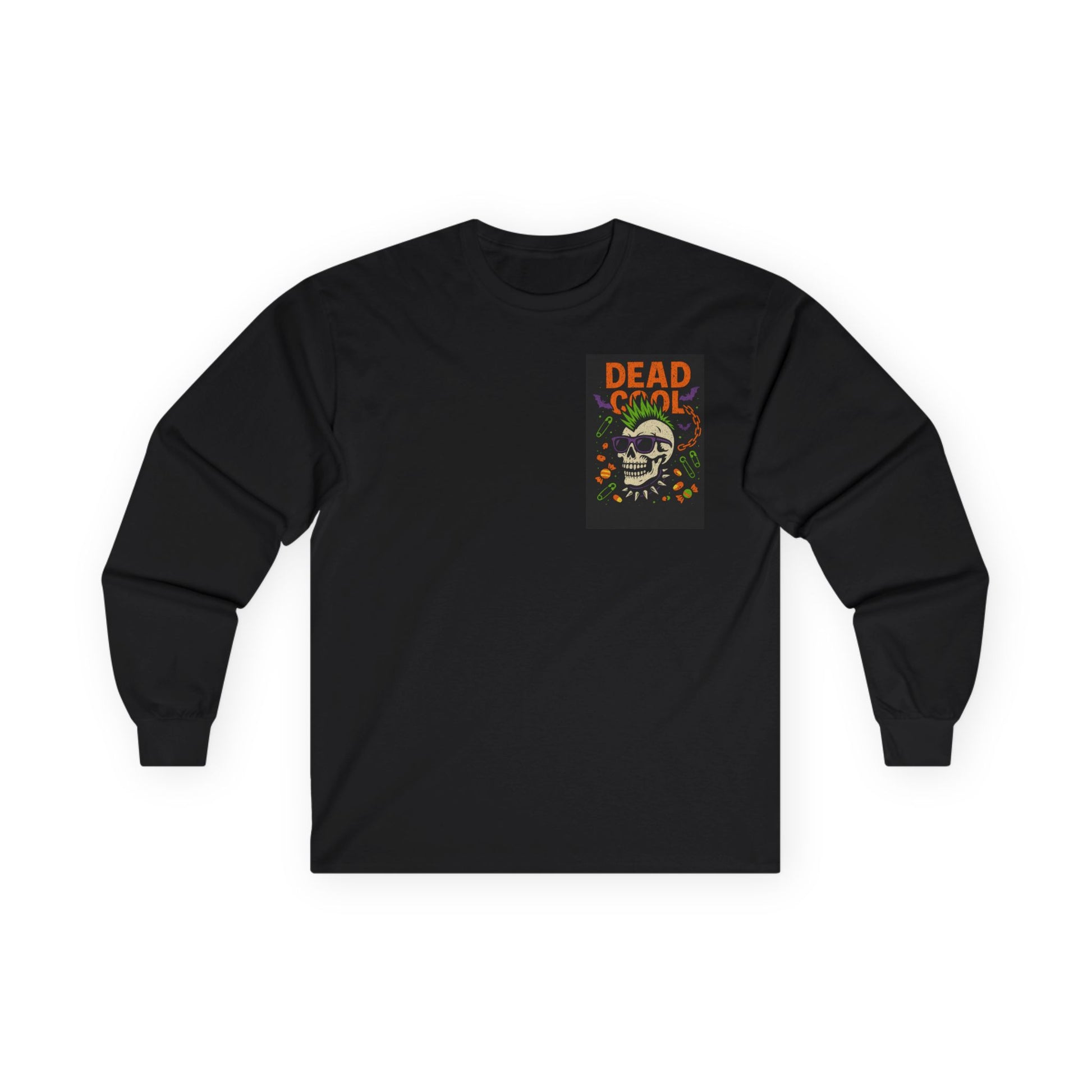 On the front, a snarling skull with a bright neon mohawk and spiked collar stares out from under purple shades, surrounded by bats, chains, candy, and safety pins. Above it, cracked punk lettering screams “DEAD COOL” — because you don’t need to try when you already own the night.