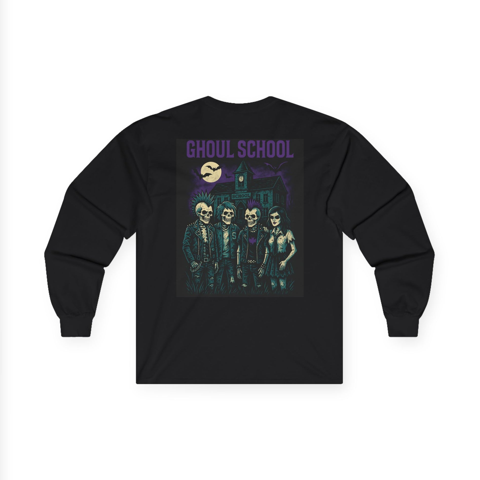 The back print goes full Ghoul School takeover. A haunted high school scene lights up the night with skeleton teens in mohawks and leather jackets hanging by broken lockers, graffiti covering the walls, and glowing light pouring from cracked windows. A ghost teacher looms by the door, a skeleton janitor sweeps candy through the fog, and bats swirl overhead. “GHOUL SCHOOL” stretches across the top like a punk yearbook title, locking in that classic teen horror band tee feel.