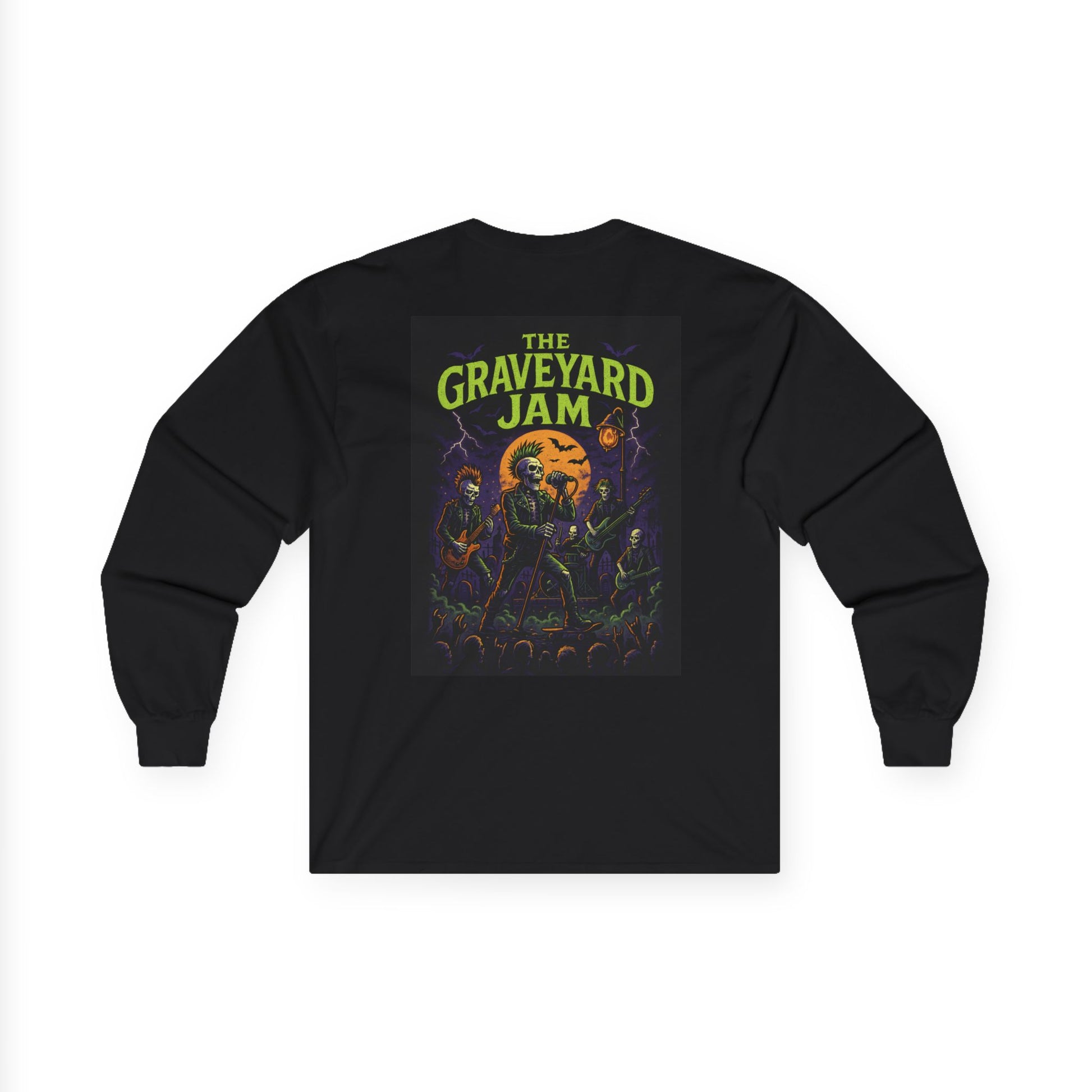 Flip it over and the back design blows the doors off. A massive graveyard concert scene unfolds beneath a glowing full moon. Skeleton crowds thrash in the fog, bats fill the sky, and the punk band owns the stage like headliners on Halloween night. The cracked horror-punk lettering screams “THE GRAVEYARD JAM” like it’s the tour poster you wish you could’ve stolen off a wall in 1983.