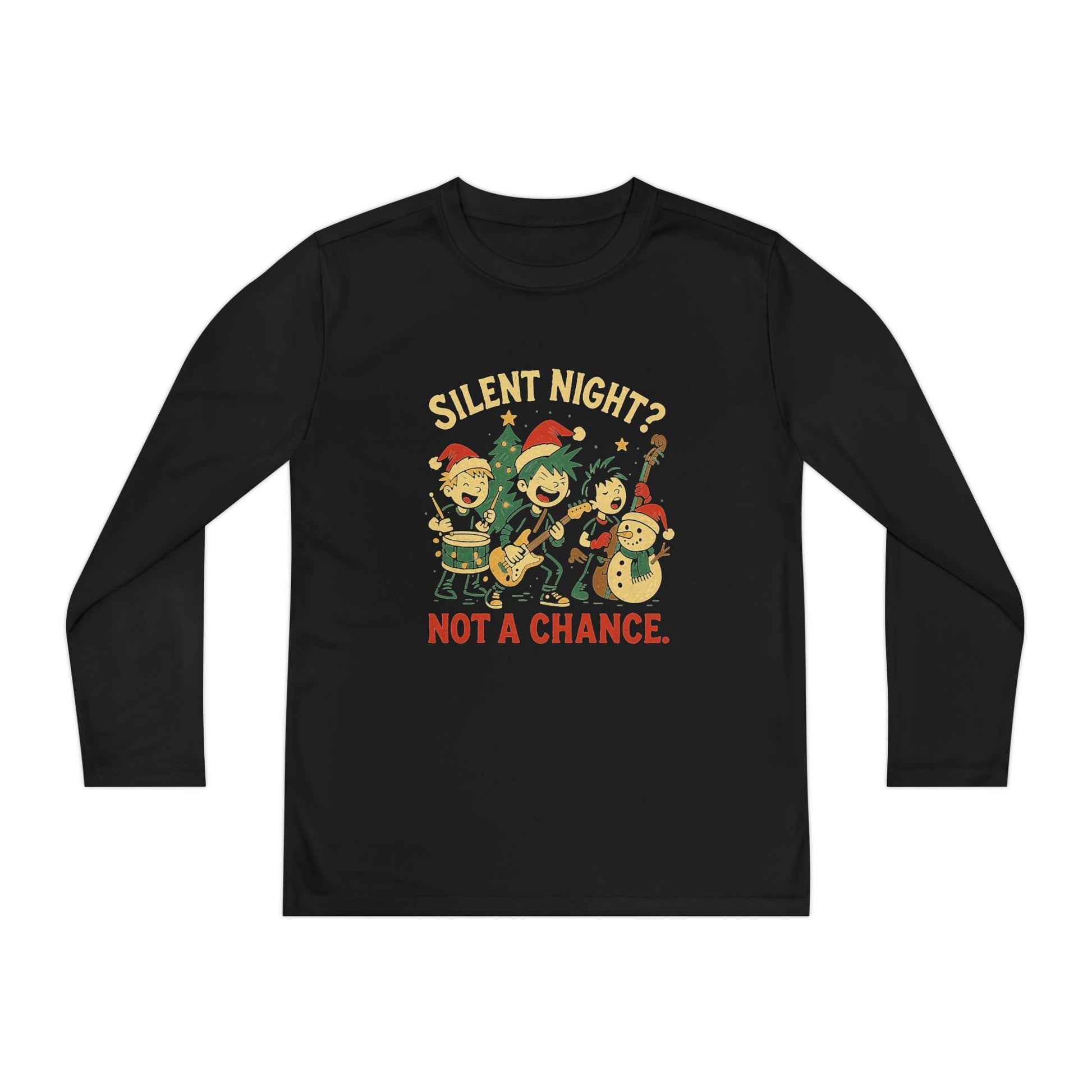 This tee captures the moment the kids form an all-out holiday punk band and absolutely obliterate any chance of quiet. Guitars shredding. Drums blasting. Snowman on upright bass because why not. Christmas tree glowing like a backstage light show.