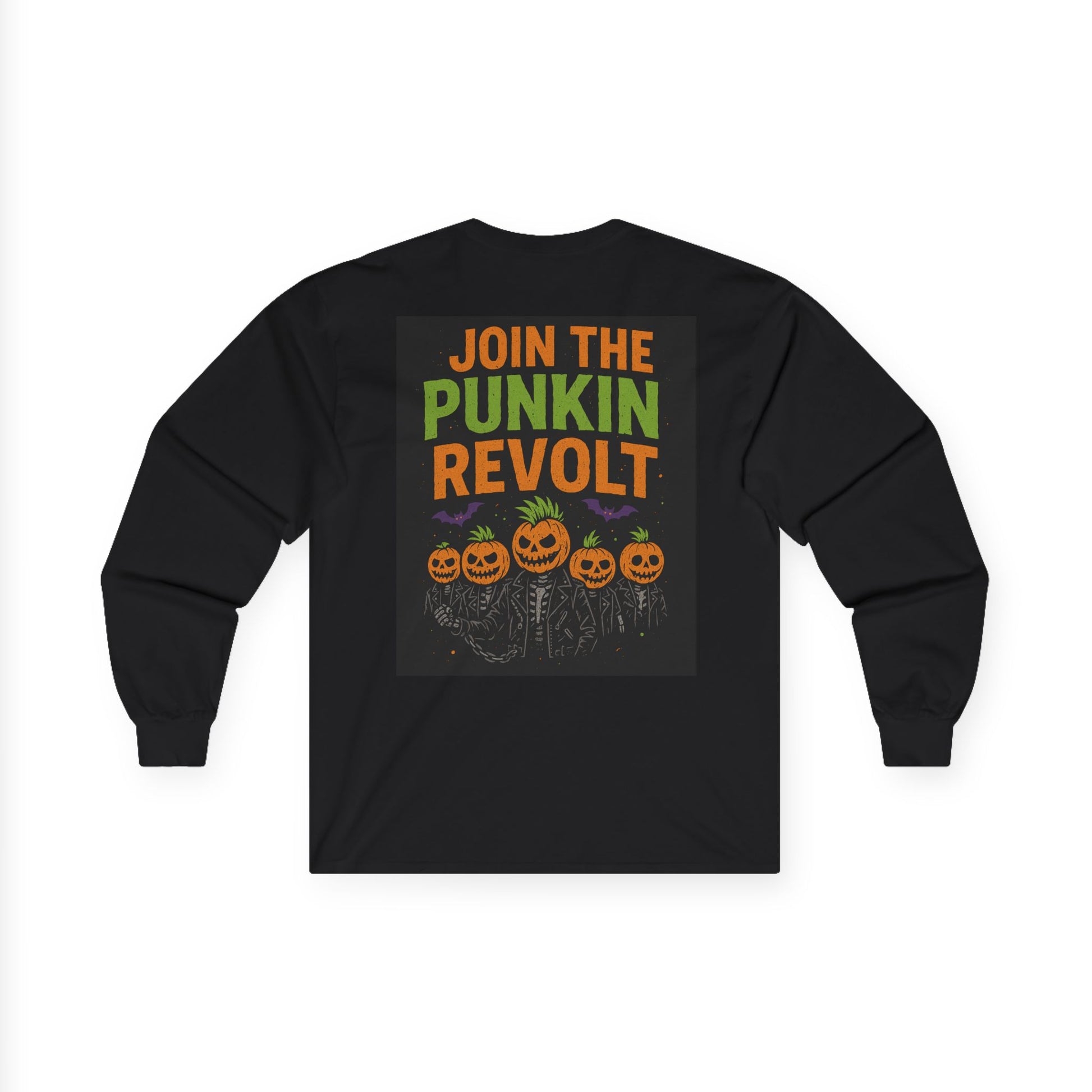 Flip it over and the back design takes it to the streets: a full-on pumpkin-headed punk crew standing shoulder to shoulder, mohawks blazing, leather jackets zipped, chains in hand, bats circling overhead. The bold slogan “JOIN THE PUNKIN REVOLT” shouts across the top, rallying anyone who’s not afraid to break the mold this season.