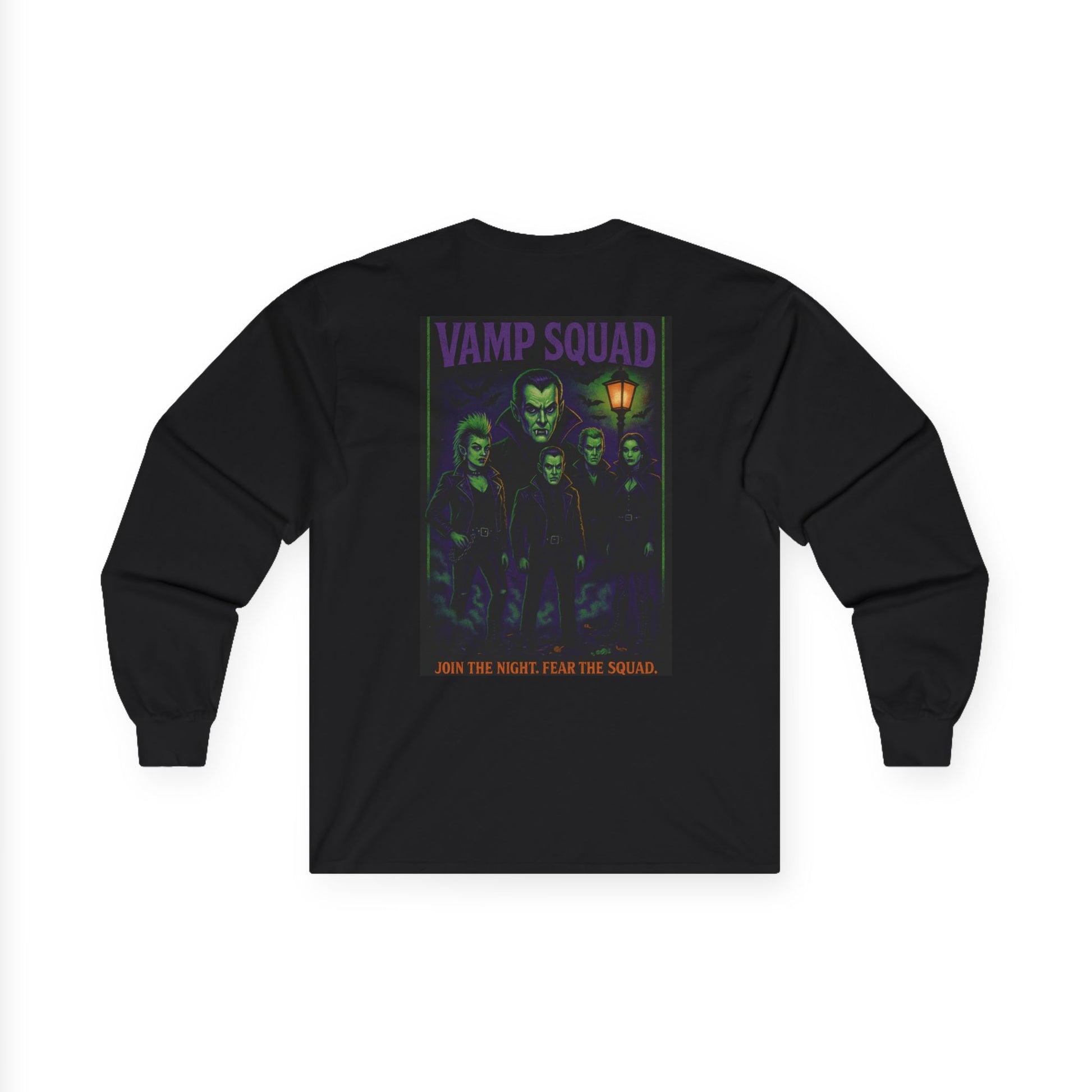 The front graphic sets the tone with the Vamp Squad crew lurking beneath a flickering streetlight. Mohawks, boots, capes, and fangs collide in a perfect mix of punk rebellion and classic vampire cool. Bats swarm overhead, candy litters the ground, and the glowing light cuts through the fog like a midnight spotlight.