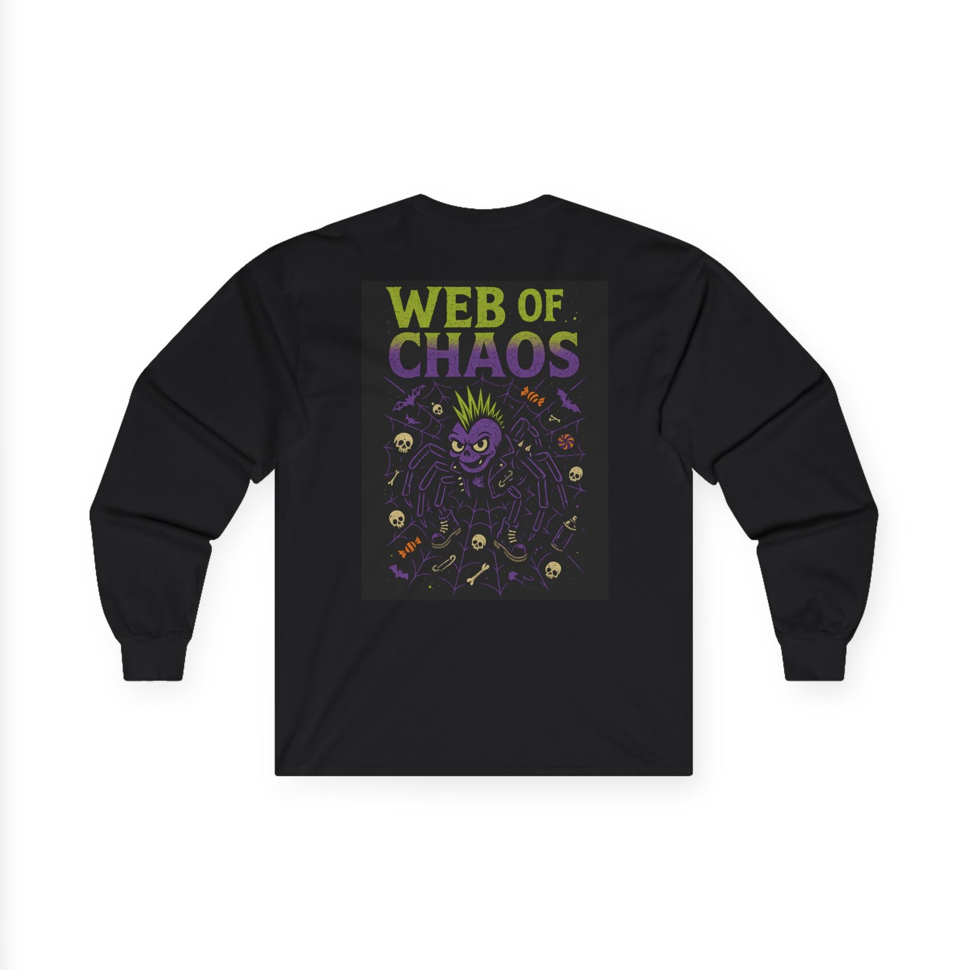 Then the back print goes full chaotic masterpiece. A giant punk spider — mohawk, leather jacket, safety pins, boots — sits at the center of a sprawling Halloween web. Trapped in the web are skulls, bones, candy, bats, and spray paint cans, with skeletons tangled in the mess. Neon green, purple, and orange pop against the black tee as “WEB OF CHAOS” arches across the top like a Halloween punk tour poster.